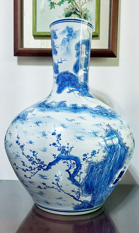 康熙開始復燒天球瓶後,目前可見的康熙天球瓶數量亦很稀少,其原因也可能如上述所述,燒製技術仍不夠成熟,所以燒製不多,而如此碩大的天球瓶(高64公分、腹徑46.5公分)只此一顆,康熙朝沒有比它更巨大的了,且其青花發色整顆均為經典的翠毛藍,康熙最大尺寸天球瓶現世