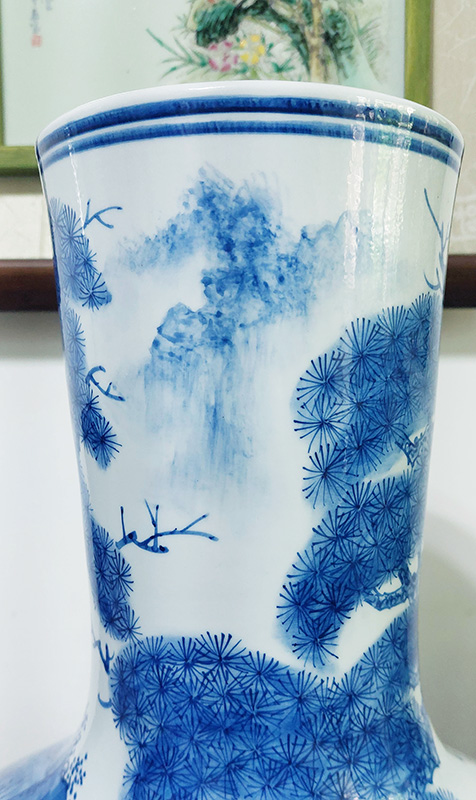 四、本天球瓶整體青花所表現的為經典翠毛藍,與民窯呈現所謂的翠毛藍,在顏色上還是有些差異(官窯與民窯其青花的原料或配比不同所致)。